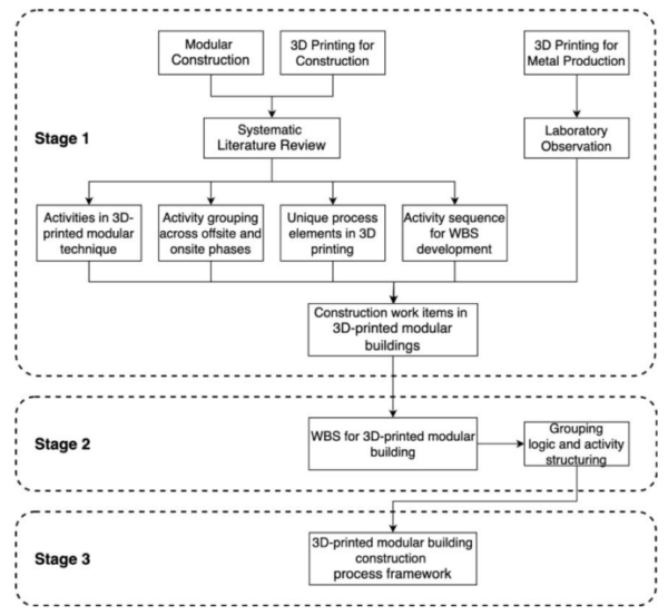 To develop the WBS and construction process framework for hybrid 3D-printed modular buildings, the study used a qualitative exploratory approach in three stages, addressing the identification of activities and workflow modeling.