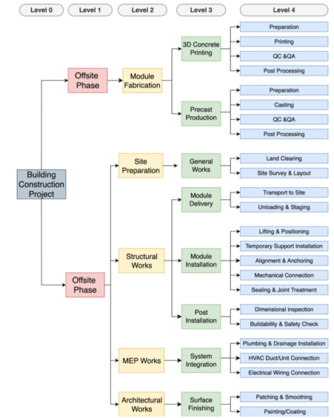 This research develops a Work Breakdown Structure and construction process framework for hybrid 3D-printed modular buildings, combining 3D concrete printing with precast techniques to improve precision, reduce material waste, and integrate automation, providing a structured approach for planning and executing construction projects.