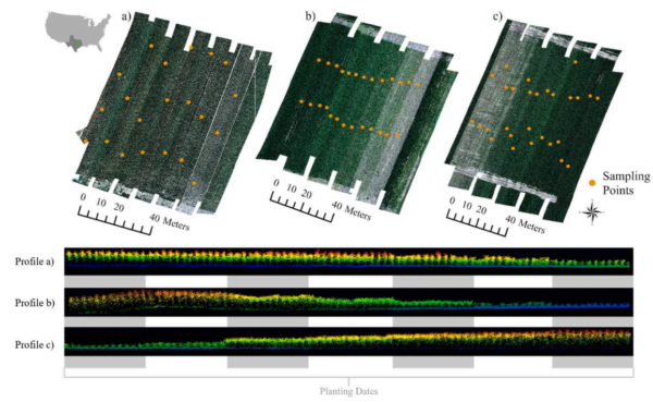 The study conducted by Flynn et al. assessed the effectiveness of UAV-based LiDAR in measuring CH and LAI for corn crops under different light conditions. The research was carried out at the USDA-ARS Grassland Soil and Water Research Laboratory and the Texas AgriLife Blackland Research Center in Temple, Texas. The experiments involved multi-planting date corn fields with varying topographies and tillage practices.