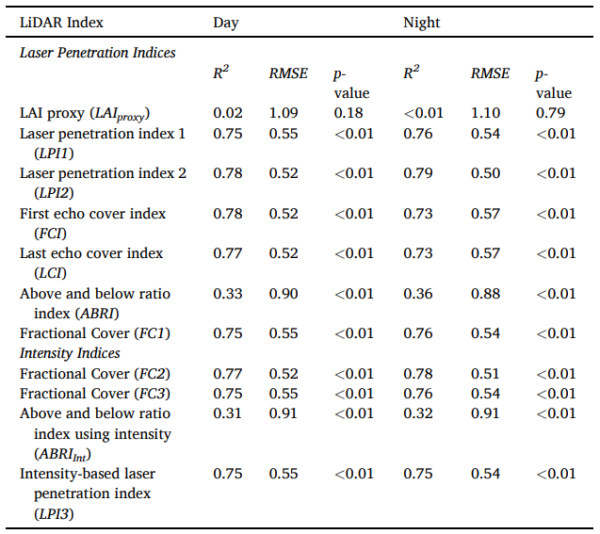 The findings of the study demonstrated a high correlation between LiDAR-based and in-situ measurements for both CH and LAI. Specifically, CH measurements showed a correlation coefficient (R²) of ≥ 0.91 with a root mean square error (RMSE) of ≤ 15.43, while LAI measurements had an R² of ≥ 0.77 and an RMSE of 0.52. These results indicate that LiDAR can reliably replicate traditional measurement methods.