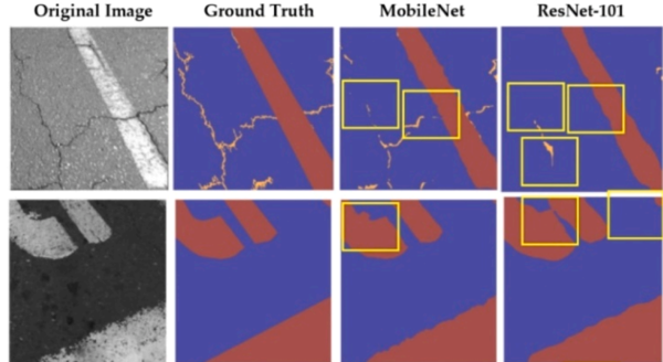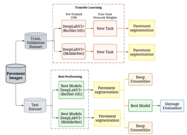 The researchers utilized state-of-the-art deep learning models, specifically DeepLabV3+ with ResNet-101 and MobileNet backbones, for semantic segmentation and evaluation of pavement distress. These models were fine-tuned using Optuna for hyperparameter optimization, improving performance by addressing challenges from image variability, noise, and road surface complexities. Segmentation focused on four classes: cracks, potholes, alligator cracking, and pavement marking. The MobileNet backbone achieved a mean Intersection over Union (mIoU) of 89.25% and an F1-Score of 92.09%.