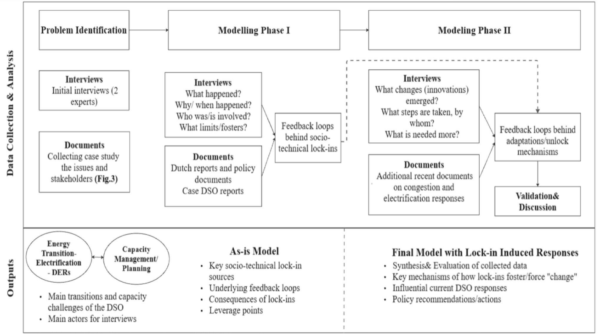 Data collection involved four steps: problem structuring via initial expert consultations; semi-structured interviews with 11 DSO specialists in energy transition, congestion management, and grid strategy, conducted from December 2023 to March 2024, supplemented by document reviews including the Dutch Climate Agreement, E-Directive, and congestion programs; two-phase modeling to depict lock-ins and incorporate responses; and expert validation.