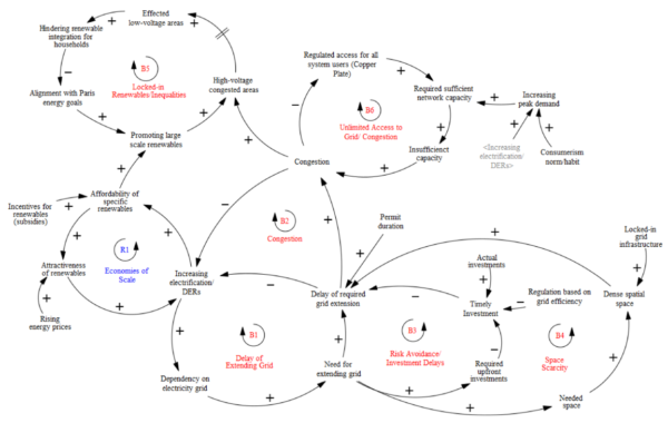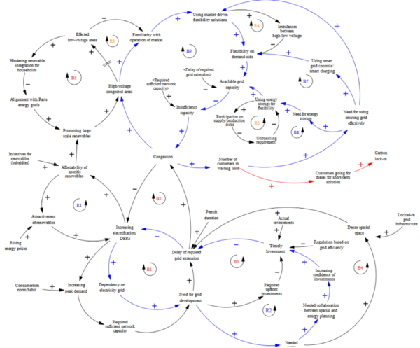 The researchers used qualitative system dynamics to map feedback loops in grid capacity planning, identifying lock-in mechanisms and intervention points. This systems-thinking approach visualizes causal relationships with reinforcing (R) and balancing (B) loops. The study examined a Dutch DSO serving 3.3 million connections over 93,000 km in congestion-prone Central-North Netherlands.