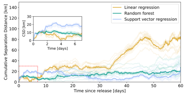 Furthermore, the generalizability of the North Sea-trained models was tested using an independent drifter dataset from the Tyrrhenian Sea. Despite the differing ocean dynamics, the machine learning models successfully reproduced observed trajectories with accuracy comparable to state-of-the-art studies, underscoring their robustness and potential for broader application.