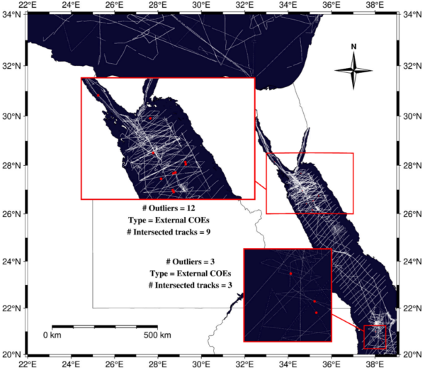 To address the inconsistencies in shipborne gravity data around Egypt, the researchers implemented a comprehensive crossover adjustment using the x2sys package from Generic Mapping Tools (GMT). This methodology involved detecting intersections among tracks in geographic coordinates and evaluating the crossover errors (COEs) at these intersections. COEs refer to the discrepancies between measurements taken at the same location, either within a single track (internal crossover) or between intersected tracks (external crossover).