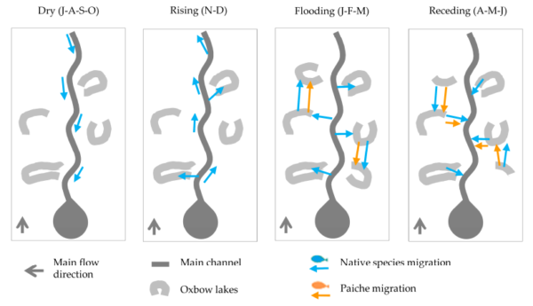 Meandering river floodplains, such as those along Bolivia’s Beni River, feature dynamic ecosystems where oxbow lakes form through channel cutoffs and evolve over time. These lakes serve as aquatic habitats influenced by hydrologic connectivity, primarily driven by overbank flows during flood pulses. This connectivity enables fish to migrate between the main channel and floodplains for spawning, feeding, and shelter, impacting fish abundance and the livelihoods of local fishing communities. High recruitment rates often follow extensive floods, increasing catches in subsequent years, while low-flow periods concentrate fish for harvesting.