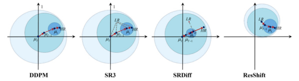 mean µt, and the radius denotes the variance ∑t). ResShift employs a residual diffusion paradigm that initiates the reverse diffusion process from the LR distribution,