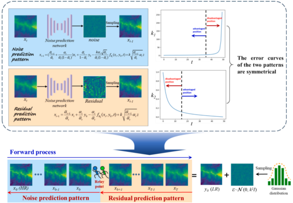 The Relay Residual Diffusion Probabilistic Model (RRDPM) marks a significant innovation in DEM super-resolution. This model leverages diffusion model principles to transform distributions between high- and low-resolution DEMs through a series of steps. The RRDPM introduces two types of inherently indivisible sampling equations, each with distinct advantages, integrated using a “relay race” approach. This method allows for efficient sampling, significantly reducing the steps required to complete the diffusion process.