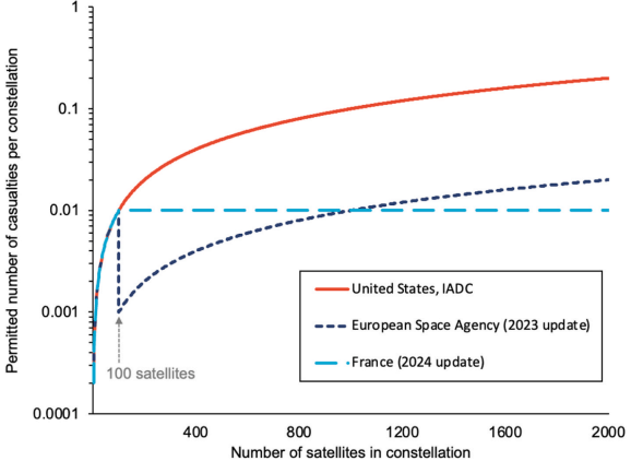 International efforts to regulate these risks vary. The United States, for instance, allows a casualty risk of 1 in 10,000 per satellite, a standard endorsed by the Inter-Agency Space Debris Coordination Committee. However, as the number of satellites increases, the cumulative risk grows, prompting some agencies to propose stricter guidelines. The European Space Agency and France have introduced more stringent standards, limiting the collective risk from large constellations.