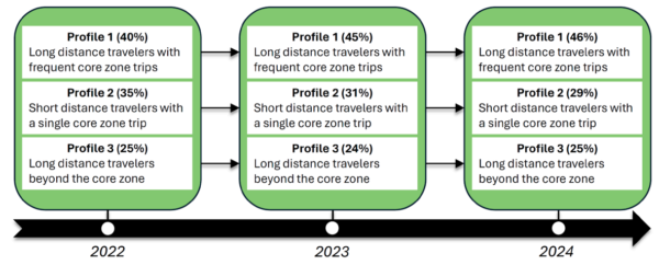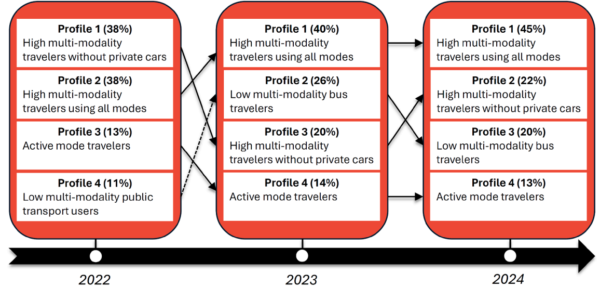 The study’s findings reveal significant insights into urban travel patterns. While spatial travel patterns remained relatively stable over the three-year period, temporal and modal patterns exhibited greater variability. A distinct shift was observed between 2022 and subsequent years, likely reflecting post-pandemic behavioral changes. Key traveler groups identified include exclusive active mode users, who accounted for 13% annually, and non-private car users, whose share declined from 38% in 2022 to approximately 20% in 2023 and 2024.