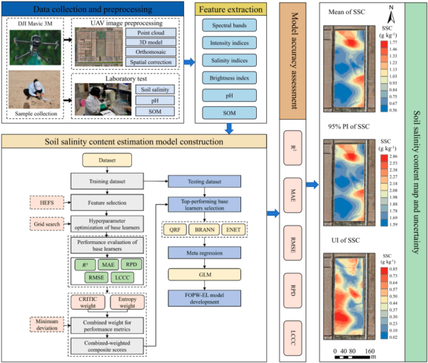 To address these challenges, the research team proposed a feature-optimized and performance-weighted ensemble learning (FOPW-EL) framework for estimating SSC using UAV imagery and soil auxiliary information. This approach integrates hybrid embedded feature selection (HEFS) to extract sensitive features and CRITIC-Entropy combined weighting (CECW) to identify optimal base learners. The FOPW-EL model leverages the high spatial resolution of UAV imagery, which allows for the detection of subtle SSC variations and small-scale features, while integrating soil auxiliary information such as soil organic matter (SOM) and pH to enhance the accuracy of SSC estimation.