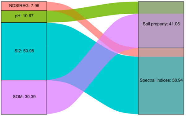 Key findings from the feature importance assessment revealed that spectral indices played a crucial role in SSC modeling, contributing 58.94% to the overall model. The study identified SOM, salinity index (SI2), normalized difference salinity red edge index (NDSIREG), and pH as the most sensitive feature variables, with SI2 showing a strong positive correlation with SSC. In contrast, SOM and pH values exhibited significant negative correlations with SSC.